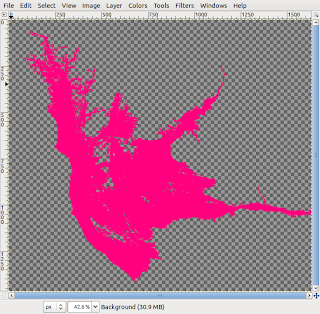 GRASS 6.4.1 (Landsat_128047):~ > r.grow input=NamNgum.bw output=NamNgum.bw.growLike in my previous workflow there were noisy pixels I wanted to get rid of. I had to export the image to edit it in GIMP. Because I set the nodata option to zero, no data pixels are shown transparent in GIMP.